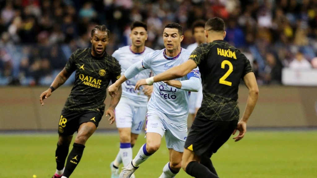 Soccer Football – Friendly – Saudi Pro League XI v Paris St Germain – King Fahd International Stadium, Riyadh, Saudia Arabia – January 19, 2023 Saudi Pro League XI’s Cristiano Ronaldo in action with Paris St Germain’s Renato Sanches and Achraf Hakimi REUTERS/Ahmed Yosri